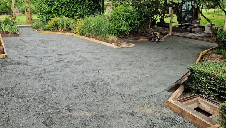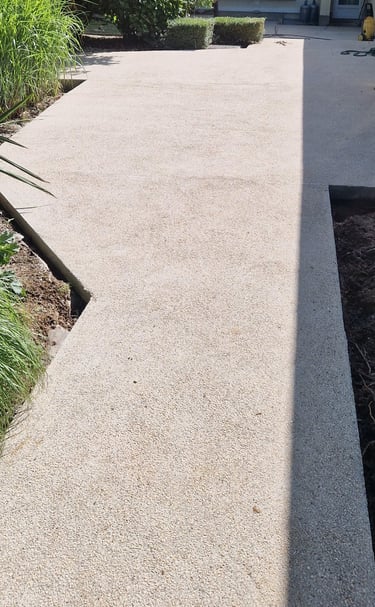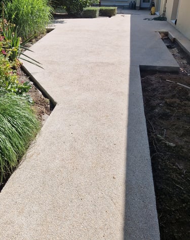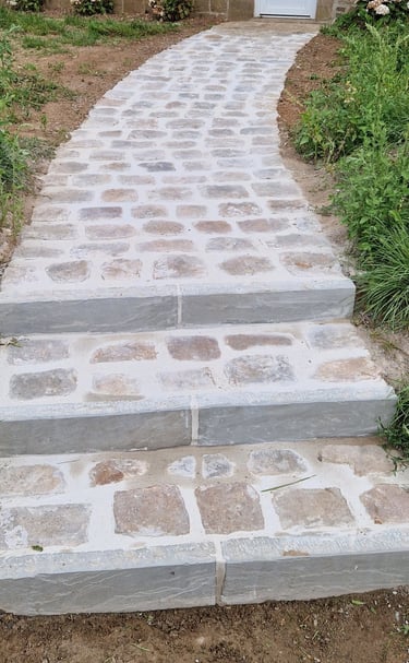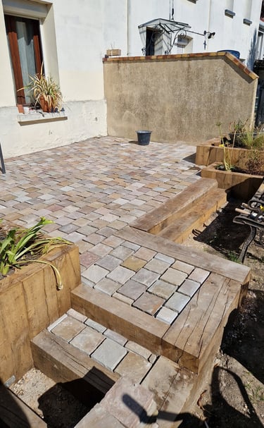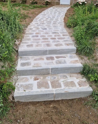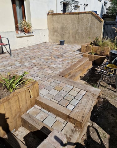 Nous réalisons vos terrasses, pavages, dallages, béton désactivé et murs de soutènement pour des extérieurs harmonieux et durables.